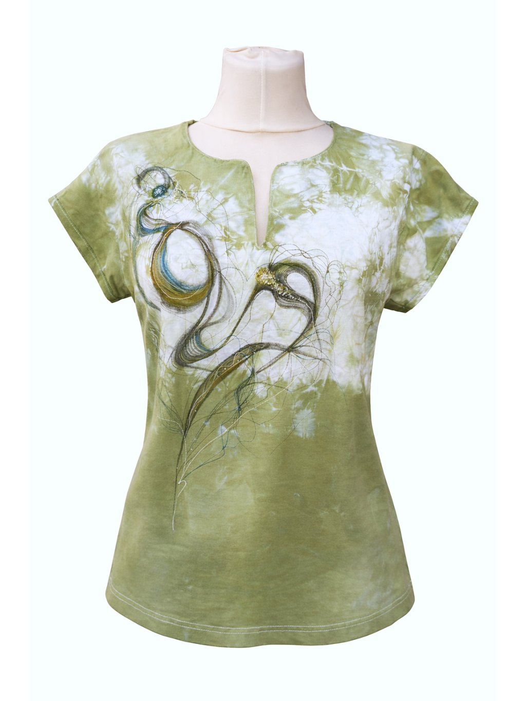 Dámské triko je ručně malované a batikované v příjemných odstínech khaki a olivově zelené s originálním motivem abstrakce.