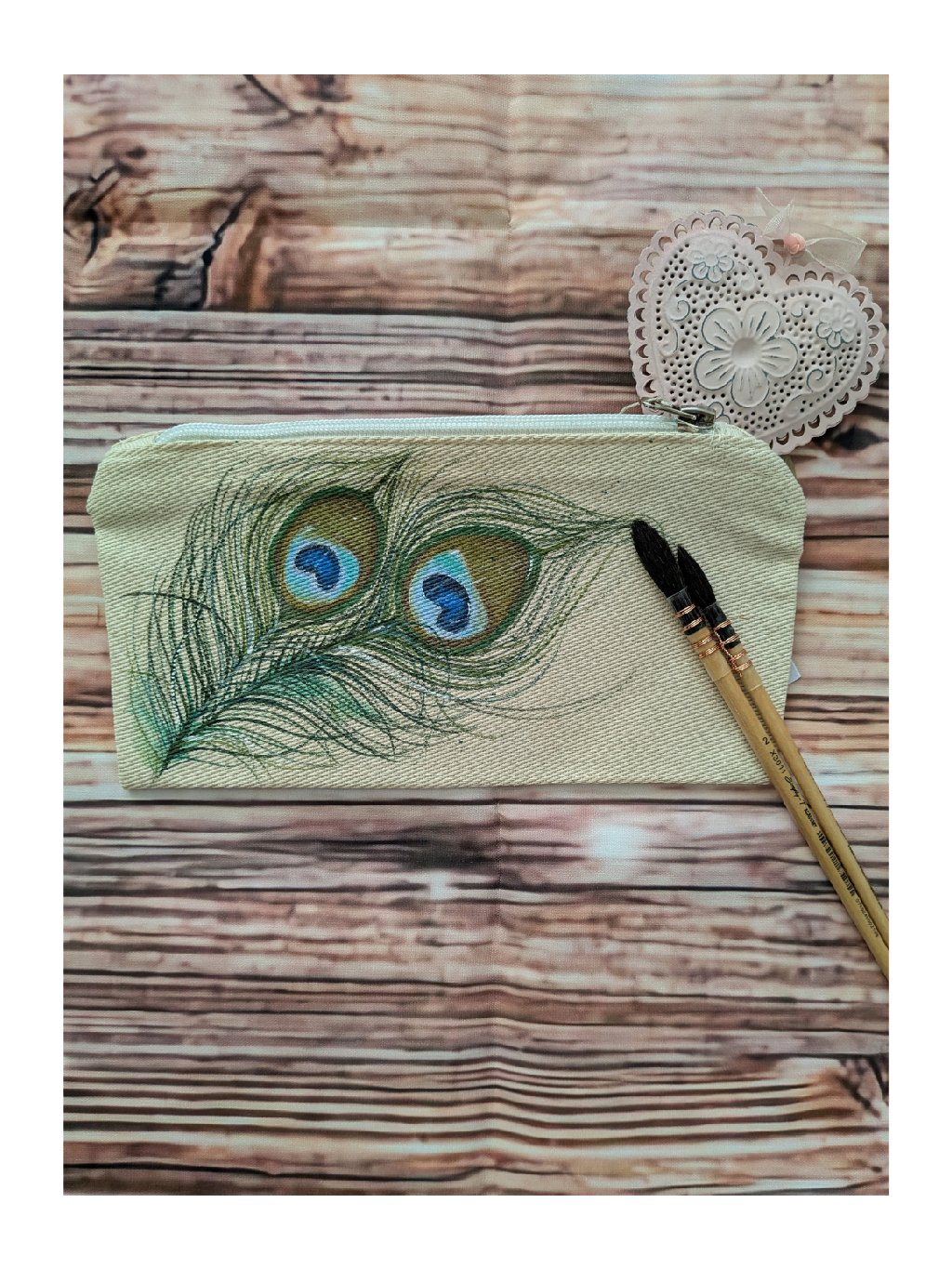 Ručně malovaná bavlněná kosmetická taštička s pavím peřím.
